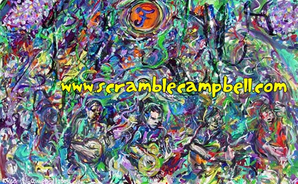 Painted during Set 2. When they busted into Maggie's Farm Scramble went wild on the canvas. Scramble was painting in the middle of the Fillmore. He captures the energy of the night with this piece.