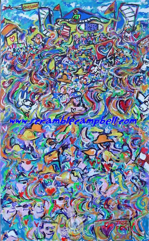 Painted live in the crowd during Jazz Fest. The painting is part of a 2 piece set. The lower piece depicts the crowd at the festival and was painted during the Funky Meters set.