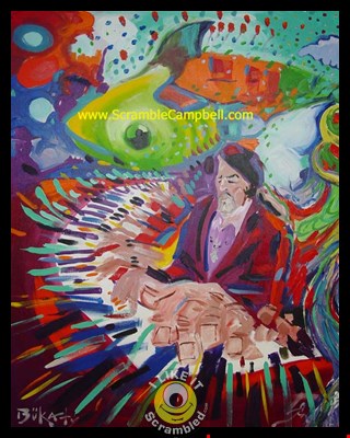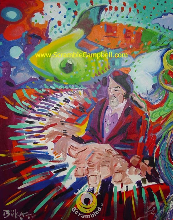 Scramble and John Bukaty painted along side each other with canvas propped side to side. They painted on their own canvas and reached across to blend them into one piece of art.