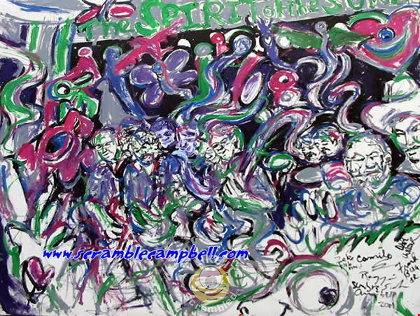 A Highly abstract painting under normal lighting. Turn on a blacklight and the piece comes alive.